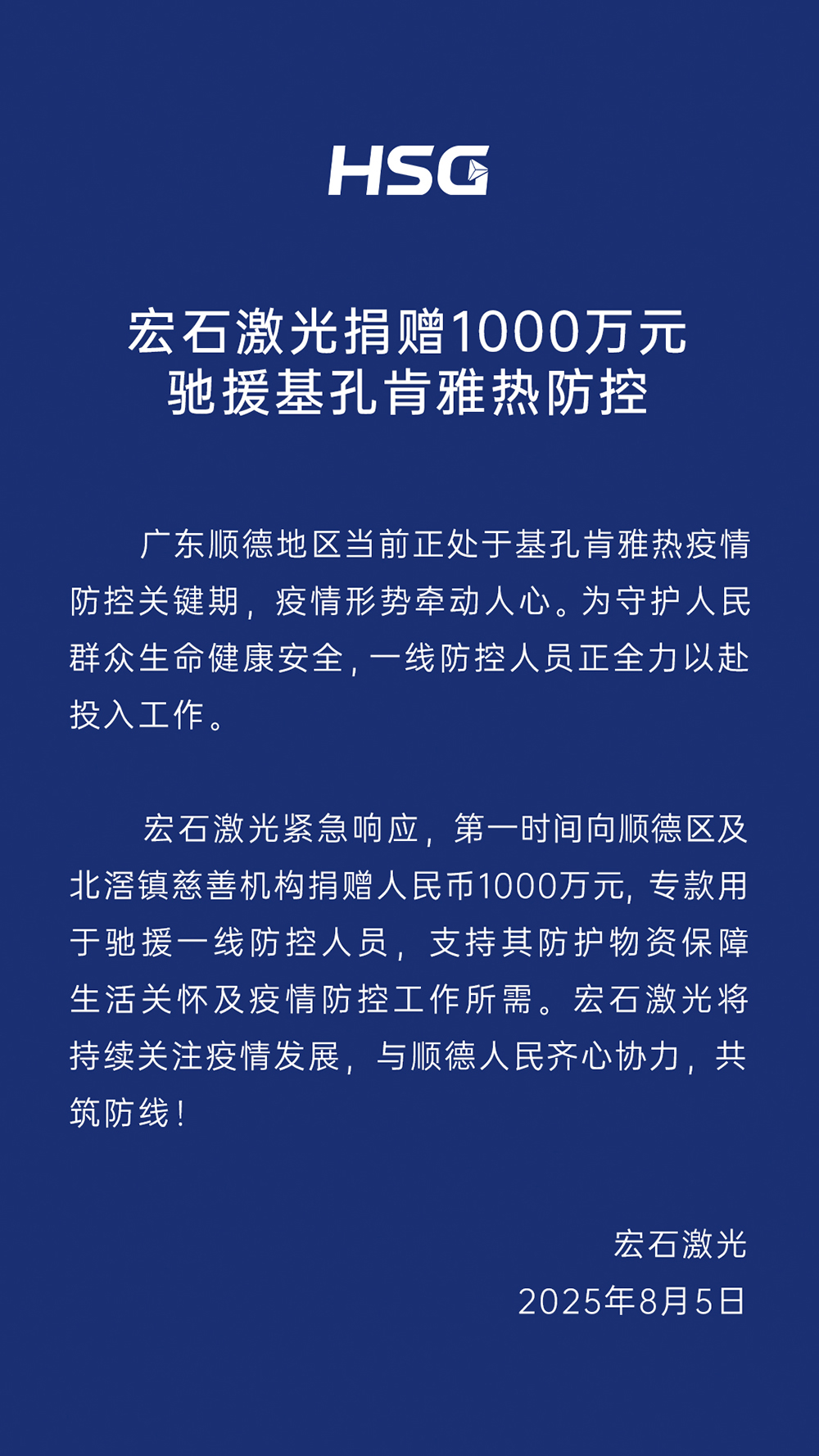 宏石激光捐贈1000萬元馳援基孔肯雅熱防控