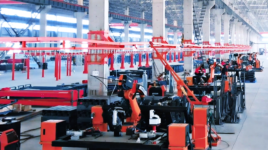 產線上配套國內先進的激光切割機,數控折彎機、庫卡機械手臂,川崎焊接機器人及相應配套的四軸、三軸變位機,自動噴涂機器人等智能自動化設備?!倍値ьI宏山銳視角團隊穿行在產線間,各類機器設備有條不紊地流轉、托起、加工、下料;大型零部件在車間內歷經多道加工,從平面到造型,從裸色到上色。整個車間在極致的有序中,譜寫著年產能30000臺的實績。